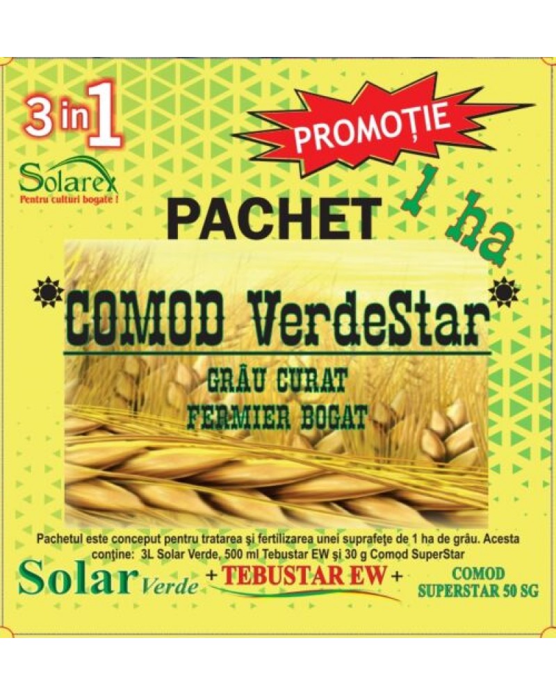 Pachetul COMOD VERDESTAR 1ha este conceput pentru erbicidarea , tratarea impotriva bolilor si fertilizarea foliara a unei suprafete de 1 hectar de grau.